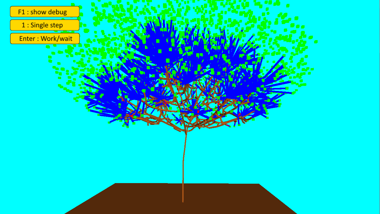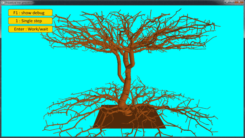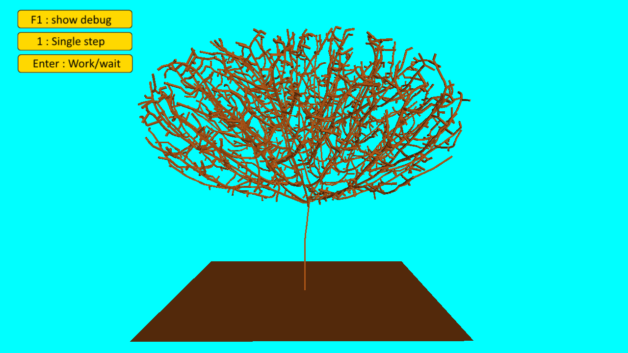 Once the crown of the tree is defined the algorithm generates the tree. This process can be seen as it is happening. Once it is done, the topology of the tree is rendered using lines to represent branches. The user can then choose to apply some post-processing of the tree structure to reduce the node count and generate a simple representation of the body of the tree.