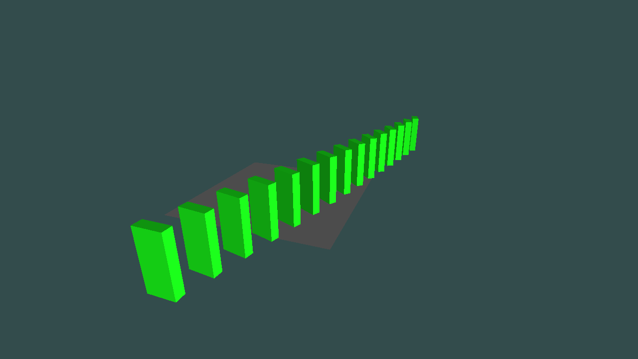 This project is the final coursework for the Physics-Based Animation module. The module focused on teaching techniques and algorithms for building physics engines. Over the course of the module, concepts like particles, springs and cloth simulation were thought. The aim of the final coursework though, was the creation of a physics simulation that realistically represented a domino effect using cuboids.